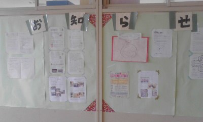PTA室の前にはお知らせの掲示板があります。中学校のことはもちろん、柏木小学校のことや南大沢小学校のことも掲示されています。3校のPTAはよく連携が取れているんですね。