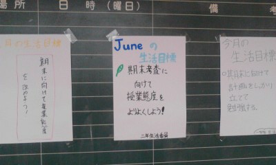 今月の各学年の生活目標です。期末考査に向けた取組ですね。
