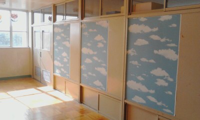 PTA室前の壁紙が変わりました。青空と白い雲、夏の空です!