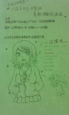 各階に八王子市立中学校夏季演劇交流会のポスターが貼ってあります。7月27日(土)北野市民センターで行われます。