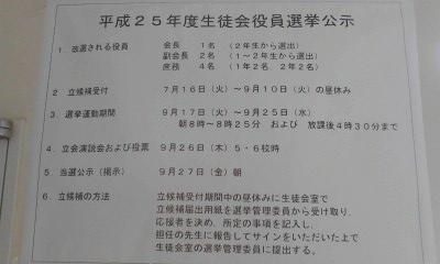 生徒会役員選挙が公示されました。立候補の締め切りは9月10日。選挙は9月26日です。