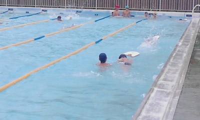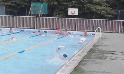 今日は曇っていて、風もあるので助かっています。サッカー部はクールダウンと全身運動で水泳の練習中です。アンサンブル部は今日2回目の練習です。