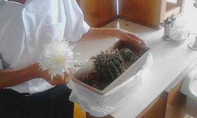 生物部1年生とサボテンの花です。白い大きな花です。