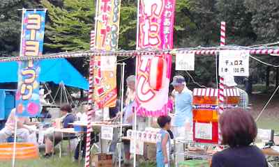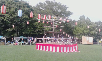 出店もたくさんでています。きれいな幟ですね。やぐらも準備完了。