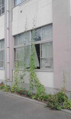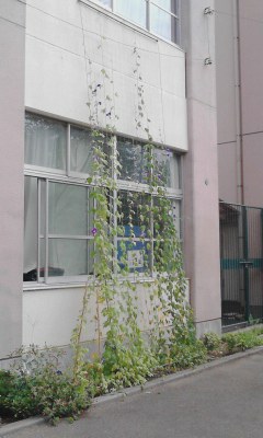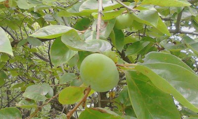 柿の実が大きくなりました。アサガオは2階の窓に届きました。ゴーヤはもう少しです。