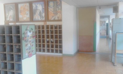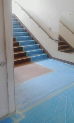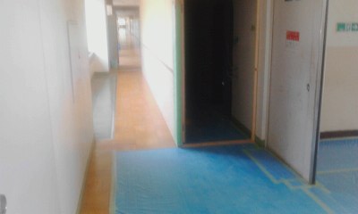 トイレ改修工事。校舎内。今日はトイレの電気を外す工事を行うそうです。内外ともに安全には十分配慮して行っています。