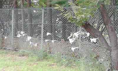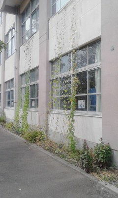ユリ(今校地内にたくさん咲いています)とアサガオ(大分伸びました)と奥がゴーヤです