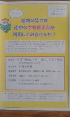 9月2日に第1回を実施。10月7日には第2回実施予定の地域向け図書貸出のポスターをスタッフの方が作成してくださいました。南中図書貸し出しキャラ?が載っていますね。