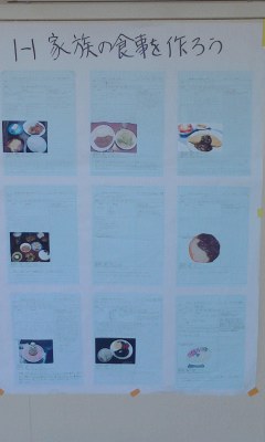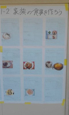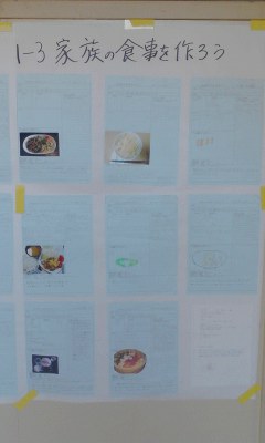1年生の廊下に、夏休みの家庭科の宿題「家族の食事を作ろう」が貼ってあります。
