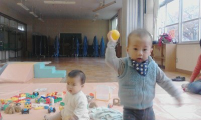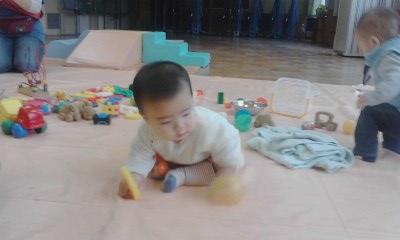 ゆうゆうクラブの赤ちゃん広場です。天気のせいでまだ赤ちゃんが少ないです。ボール投げが上手!!