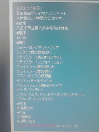 石田さんのホームページに明日のヴァイオリンコンサートの案内が出ていました。とても楽しみですね。