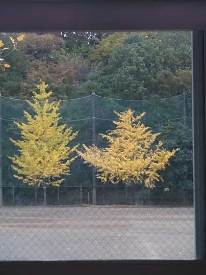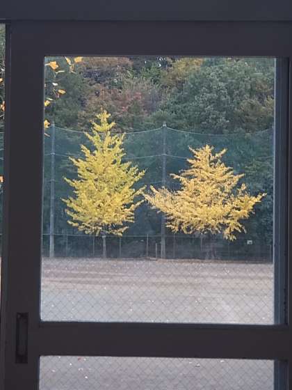 まるで額に入った秋の風景画のようなイチョウです。1年生の昇降口から見えます。