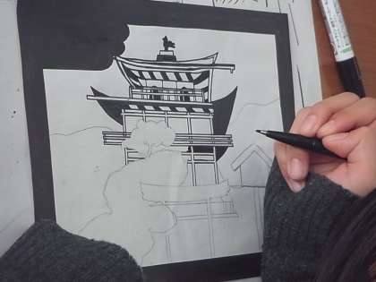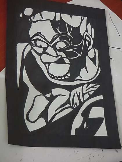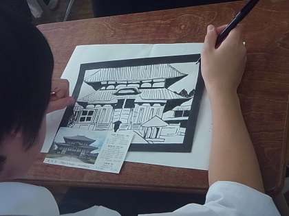 美術の切り絵の授業です。どの生徒も工夫を凝らしています。