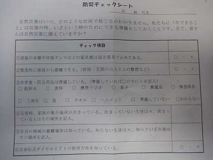 昨日、避難時の危機回避について考える学級活動を行いました。防災チェックシートを元にいざという時のためにできる準備を考えました。