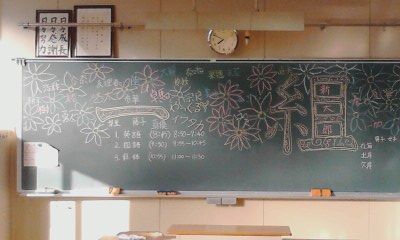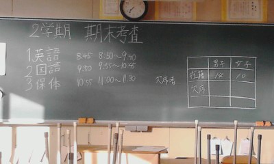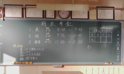 今日は期末考査初日。朝、各クラスの黒板にはその準備ができています。3年生の教室には昨日のクラス写真撮影の残り香が・・・