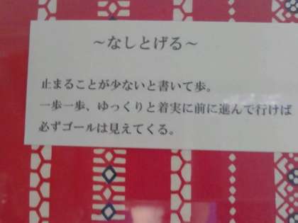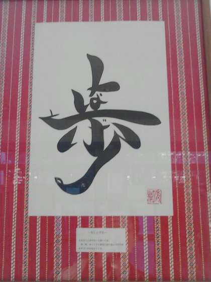 10月12日の道徳授業地区公開講座にいらっしゃって、講演していただいた浦上さんの作品、歩(なしとげる)を2.3年生の昇降口に飾りました。みんなの前で、筆を口にくわえ心を込めて書いてくださった作品です。「止まることが少ないと書いて歩。一歩一歩、ゆっくりと着実に前に進んで行けば必ずゴールは見えてくる。」