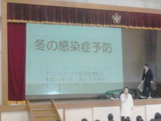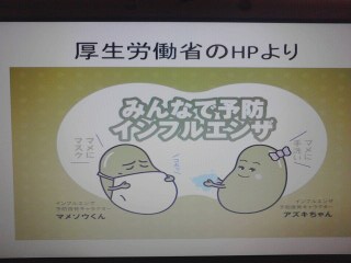 安全指導の後は、井口先生の保健指導です。冬の感染症予防。厚生労働省HPからマメゾウくんとアズキちゃんも登場しました。マメにマスク!マメに手洗い!