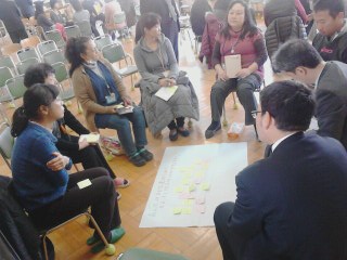 今回のテーマは、前回の「どんな人に育ってほしいですか」を受けて、「南大沢の大人としてどんなことができそうですか」でした。6人程度のグループに分かれ、自己紹介の後にファシリテーターの司会で始まりました。