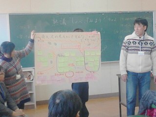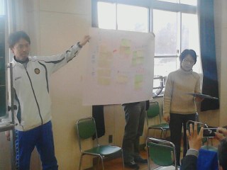 参加者は、地域の方、保護者、学校の先生、学校運営協議会の委員です。約1時間の話し合いの後各グループの発表です。