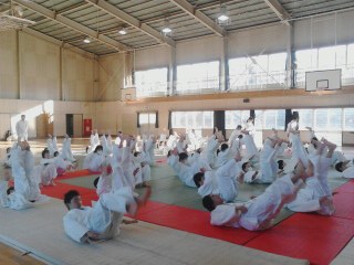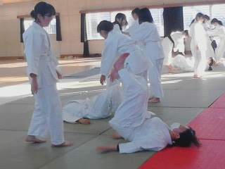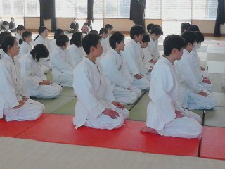 3年生の体育の授業です。凛々しい柔道着姿です。先生の話を聞く時も、正座です。
