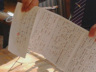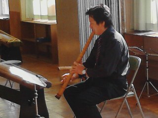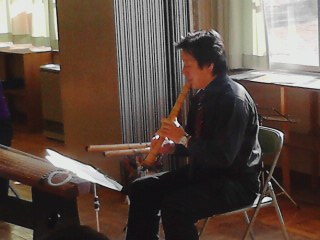 途中で木藤先生が昔の虚無僧同士が、あいさつの代わりに吹いたという曲を演奏してくださいました。尺八の楽譜です。尺八は長さの違う3本を用意していらっしゃいました。