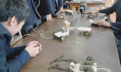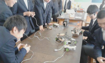 技術の授業です。完成した動くおもちゃ?を試しています。なんと楽しそうな顔でしょう。