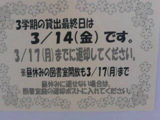 今年度最後の図書貸し出しのポスターが掲示してあります。貸出最終日は14日(金)17日(月)の返却です。図書室へ行こう!!