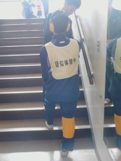 午前中に3年生の福祉体験がありました。1校時から3校時まではクラスごとに体験です。これは高齢者の疑似体験の様子です。