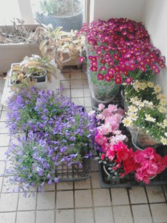玄関に花壇ボランティアの方々が植えてくださる予定の花の苗が並んでいます。とても楽しみですね。