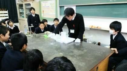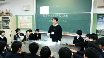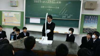 1年生の理科の状態変化の単元で、液体窒素を使った実験を行いました。バナナを凍らせてくぎを打ったり、空気や二酸化炭素や酸素を液体や固体にする実験を行いました。