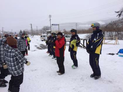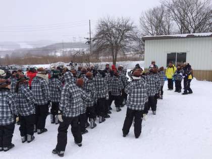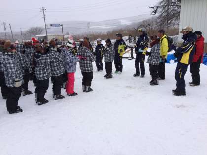 スキースクールの開校式です。いよいよスキー実習がスタートです。
