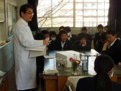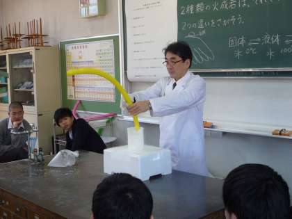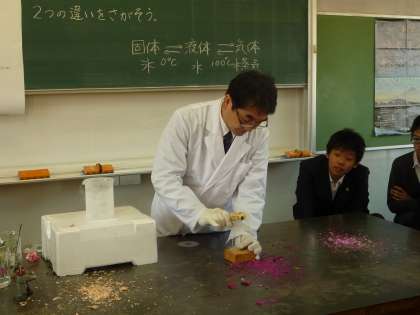 液体窒素を用いた実験では、バラの花を瞬時に凍らせたり、バナナで釘が打てるようになったり、二酸化炭素がドライアイスに変化したりする様子、3年生徒が興味深く実験の様子を観察していました。