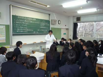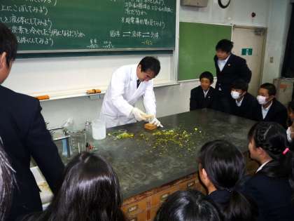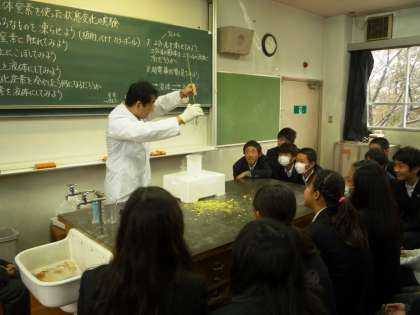 初めて見る液体窒素を用いた実験に、生徒は真剣に見入っていました。