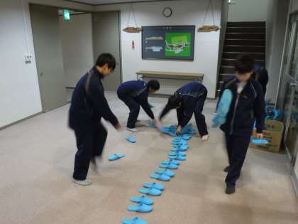 食事係は7時15分に集合です。いち早く集まった係と、そこにいた有志のメンバーでスリッパを自主的にそろえてくれました。指示しなくてもどんどん動いてくれるのでありがたいです。その後は食事係による配膳が行われます。