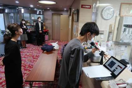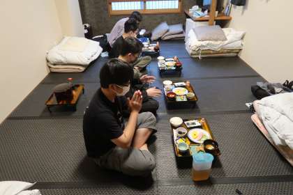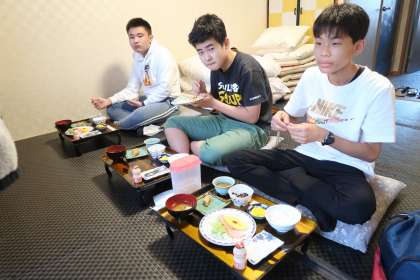 修学旅行2日目の朝は実行委員のモーニング放送からはじまりました。起床後、検温、出発の準備をして朝食を頂きました。