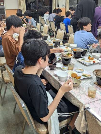 無事全班がオリエンテーリングから帰着し、入浴タイムを終え夕飯タイムとなりました。みんなお腹ペコペコで、おひつのおかわりご飯まですべて食べつくしていました。(笑)