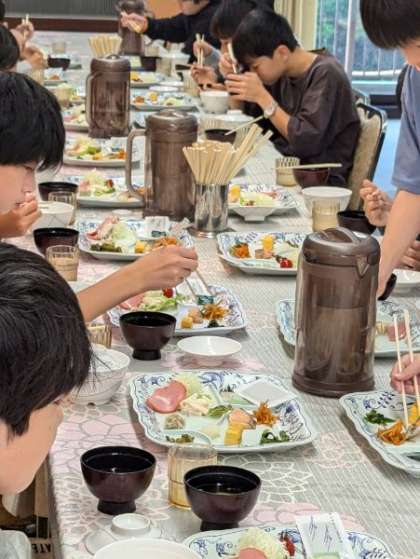 移動教室2日目の朝を迎えました。昨晩は1日目の疲れもあり、皆ぐっすり眠れたようで、朝から元気に朝食を食べています。朝の体調不良者もおらず、この後、2日目の富士山歩き等が始まります。富士山も良く見えてます。