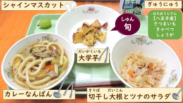 <給食の献立>〇カレー南蛮〇大学芋〇切り干し大根とツナのサラダ ※豚しゃぶサラダより変更になりました。〇シャインマスカット〇牛乳今日は、旬の八王子産さつまいもを使った大学芋です!!ほくほくしていて...