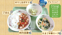 <給食の献立>〇ごはん〇四川豆腐〇たまご中華スープ〇のりしおポテト〇牛乳今日は、中華料理のメニューです!四川豆腐とたまご中華スープには、片栗粉でとろみをつけているので料理が冷めにくく、体を温めてく...