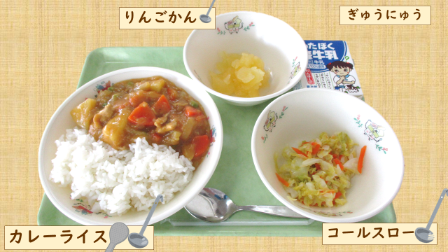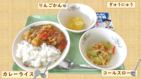 <給食の献立>〇カレーライス〇コールスロー〇りんごかん〇牛乳今日は、1年生にとって小学校で初めての給食でした!4時間目から給食の準備の話をしっかり聞いて、落ち着いて給食の準備ができていました。全学年で...