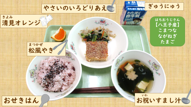 <給食の献立>〇お赤飯〇松風やき〇野菜の彩り和え〇お祝いすまし汁〇清見オレンジ〇牛乳今日は、2~6年生の進級と1年生の入学をお祝いするメニューです!お赤飯の小豆は、日本人の生活に深くかかわってきた食材...