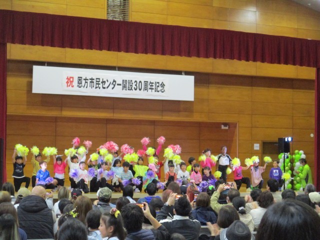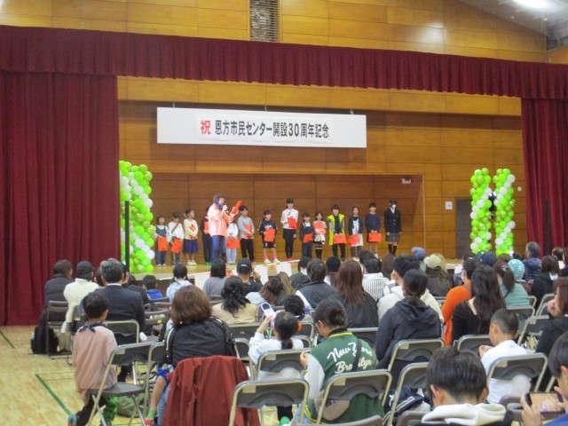 この週末、恩方市民センター開設30周年をお祝いした、「恩方市民センターまつり」が開催されました。ステージの発表では、元木小からは3・4年生がソーラン節の披露、さらには青少対主催の標語コンクールの表彰に参加をさせていただきました。たくさんの子どもたちが通っている恩方東学童も、ダンスで出演しました。