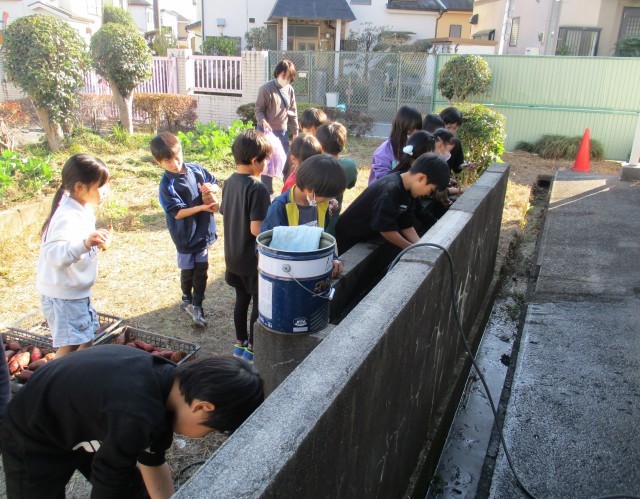 先日2年生が地域の方の畑で収穫をさせていただいたさつまいも、今日はそのさつまいもを2年生がきれいに洗っていました♪
