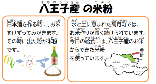 昨年11月には八王子産の新米も食べましたが、他にも米粉や酒粕が給食に登場します。