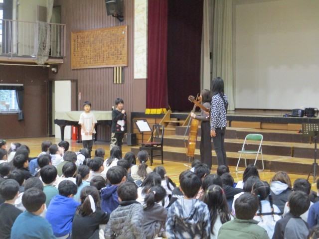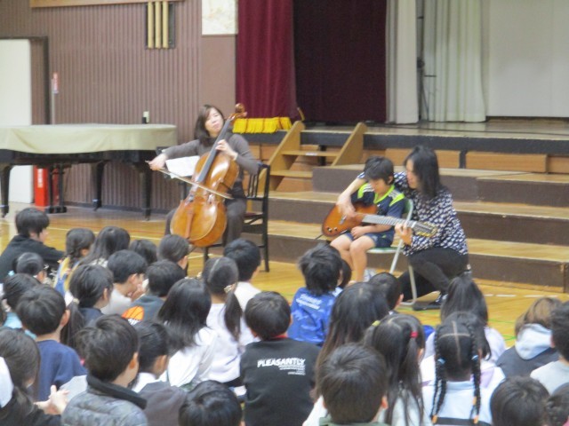 エバリーのお二方におこしいただき、アウトリーチコンサートを実施しました! 1・2・3年生が参加、こんな間近で演奏を聴くことができる、貴重な時間です!