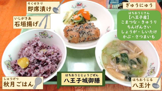 <給食の献立>〇秋月ごはん〇石垣揚げ〇即席漬け〇八王汁〇牛乳今日は、八王子城をテーマにした八王子城御膳です!秋月ごはんは、夜空に浮かぶ月をイメージして黒米ごはんに栗を入れています!八王汁には、八王...