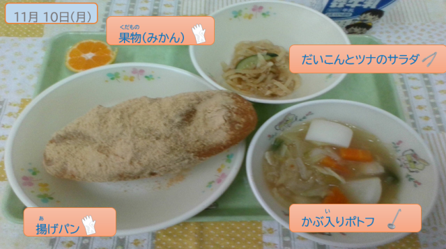【献立】 ・ごはん ・豆腐ハンバーグきのこソース ・コーンポテト ・オニオンスー...