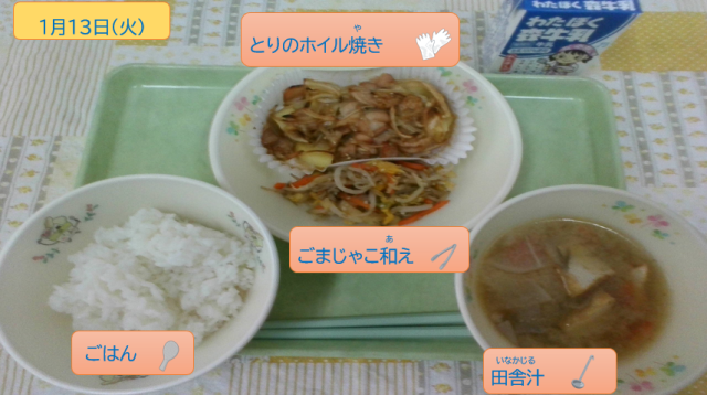 【献立】 ・ごはん ・鶏のホイル焼き ・ごまじゃこ和え ・田舎汁 ・牛乳   今...