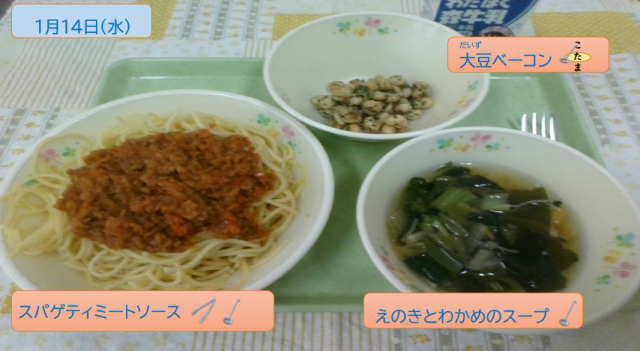 【献立】・スパゲティミートソース・えのきとわかめのスープ・大豆ベーコン・牛乳今日...