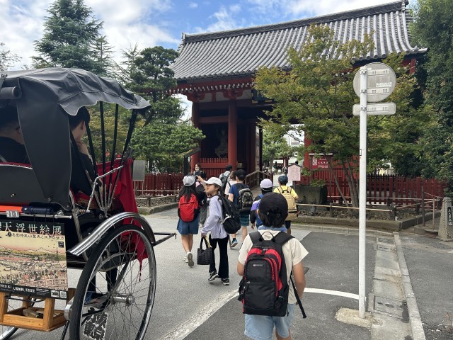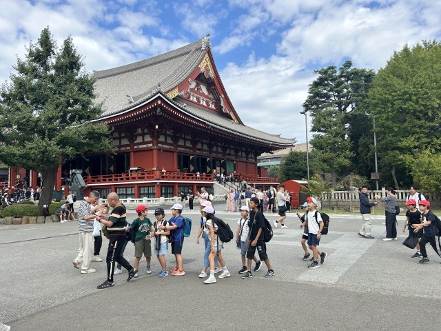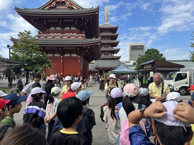 今日は4年生の社会科見学です。浅草方面に来ています。最初は浅草寺でグループごとに案内人の方からガイドしてもらいます。